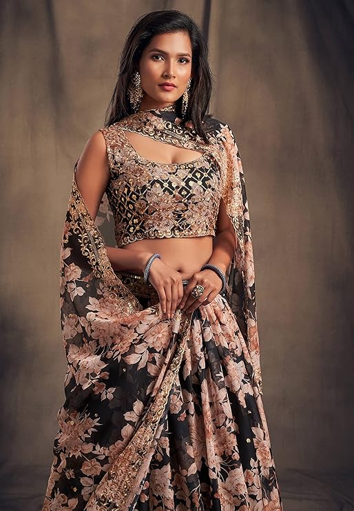 - Lehenga Work: Zari and Sequins Embroidery work with Digital Floral Print; Blouse Work: Zari and Sequins Embroidery work with Digital Floral Print; Dupatta Work: Zari and Sequins Embroidery work with Digital Floral Print